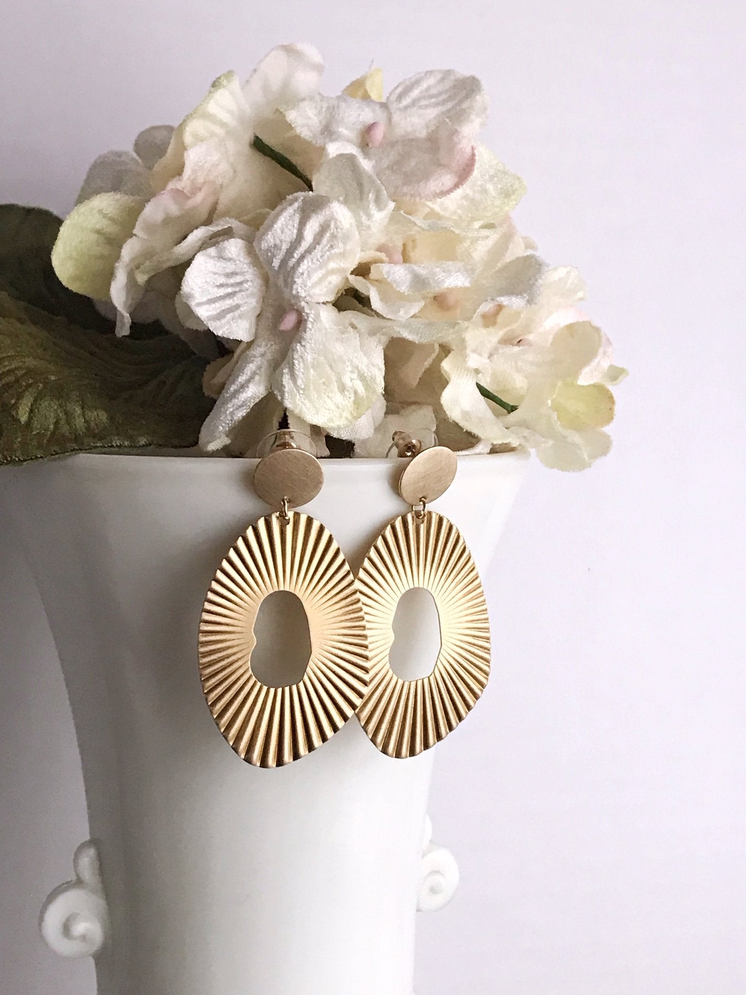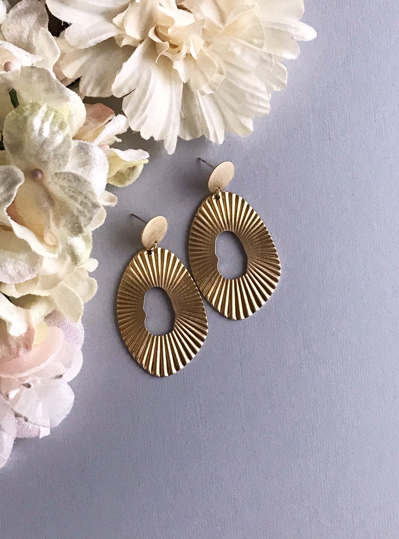 Lightweight brass hoop earrings, hand brushed with stainless steel posts. 2-1/4 x 1-1/4 inches.